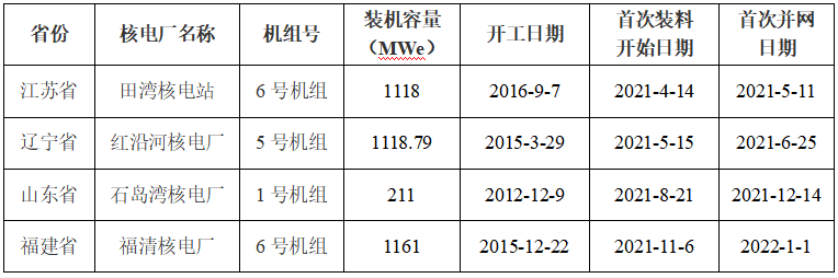截至2021年12月31日,我国运行[1]核电机组共53台(不含台湾地区),装机容量为54646.95MWe(额定装机容量)。2021年1-12月全国共有4台核电机组首次装料,详见表1。
