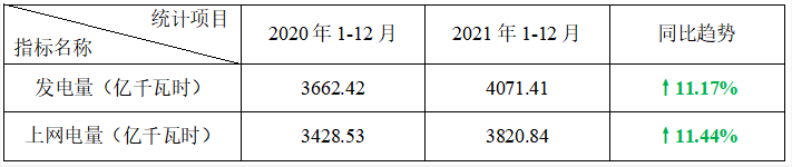 2)福清核电厂6号机组于2021年11月6日首次装料,截止12月底暂未并网发电,发电量、上网电量、核电设备利用小时数和机组能力因子暂不适用统计。