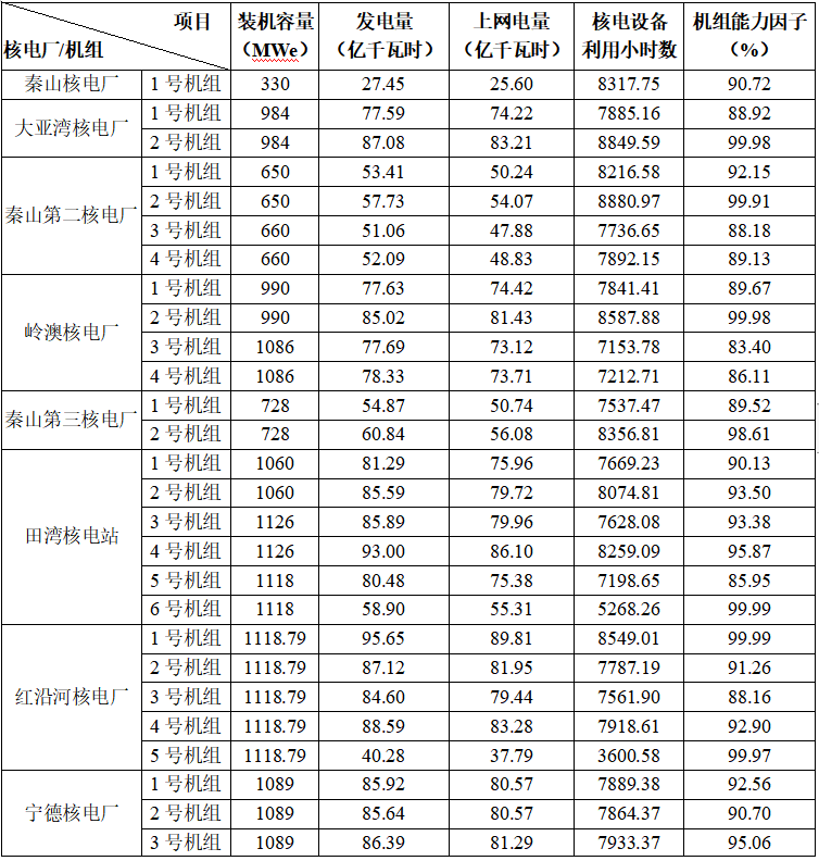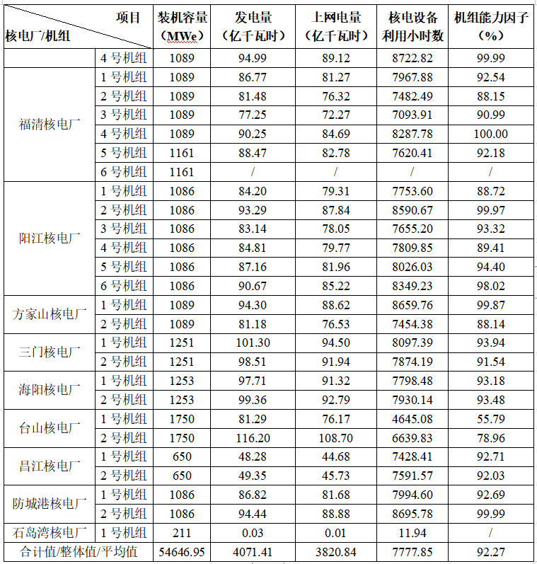 3)本表最后一行“合计值/整体值/平均值”中,装机容量、发电量、上网电量为各机组合计值,核电设备利用小时数为全部机组整体值,机组能力因子为全部机组的算数平均值。