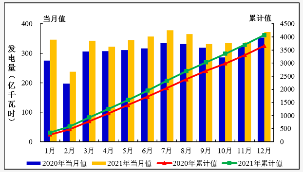 图2:2020、2021年1-12月全国运行核电机组发电量趋势