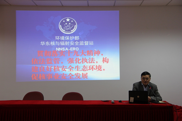 华东监督站党组书记、主任俞军同志以《贯彻落实十九大精神,依法监管,强化执法,构建良好核安全生态环境,促核事业安全发展》为题,以《核安全法》的立法历程和出台背景为切入点,从立法思路、立法目的、适用范围、相关方的权责、立法亮点等多个方面对《核安全法》进行了宣贯。结合监督中发现的典型问题,阐释了《核安全法》出台的意义和核安全监管面临的新挑战,提出了深化核安全文化建设,改善行业生态环境的对策。