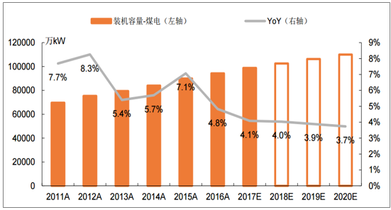 2011-2020年煤电装机容量及增速