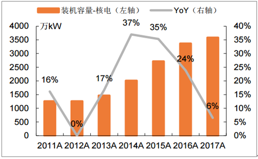2011-2017年核电装机容量年均增速18.7%