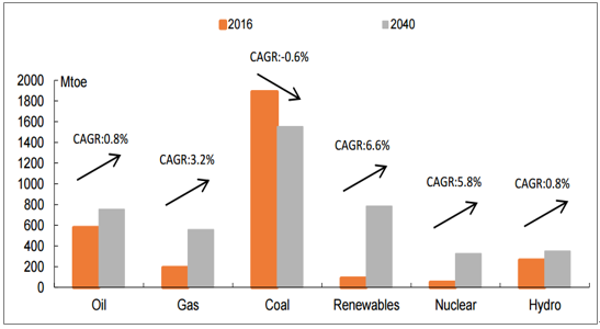 2016-2040年中国一次能源消费量成分变化