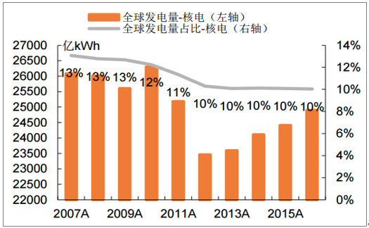 全球核电发电量在总发电量中的占比变化