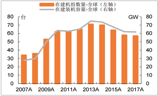 全球核电在建机组数量及装机容量