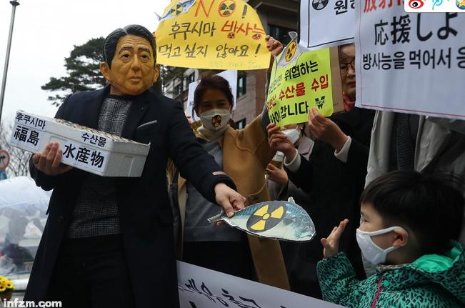 当地时间2018年3月19日,韩国首尔,民众在日本大使馆前示威,抗议进口福岛水产品。(视觉中国/图)