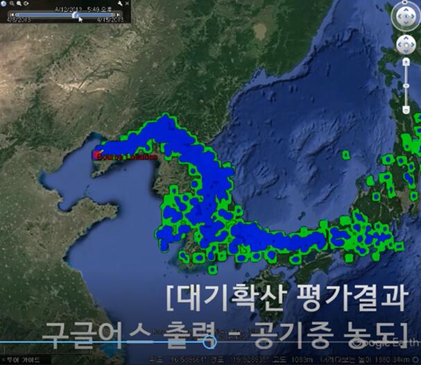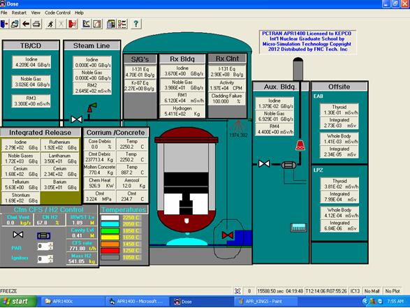 又韩国政府也采用, 和我们合作完成一套「东北亚核事故仿真系统」 Northeast Asia Nuclear Accident Simulator (NANAS), 包括我方提供的韩国所有 23 座压水堆模式,加上隣近中国辽宁红沿河,日本岛根 BWR5 和中国台湾 BWR6 沸水堆,作东北亚大区域事故演习, 当场由考官出题,随时事态加重,电站方面用电脑高速预估结果,辐射物洩出后连结他们自己的叁维 Lagrange 大気扩散演示,下风区演练应变措施,务求达到灾害极小化目的。附图为假定红沿河大破管, 所有安全装备(保括FLEX) 失效,堆心熔毁辐射外泄的分布预测。
