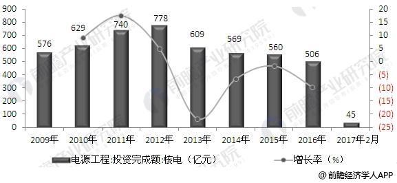 近年来,我国核电的电源工程投资完成额呈波动变化态势。据前瞻产业研究院发布的《核电行业市场前瞻与投资战略规划分析报告》数据显示,2016年,我国核电的电源工程投资完成额为506亿元,较上年同比下滑9.64%;据最新统计,2017年1-2月,核电电源工程投资为45亿元。