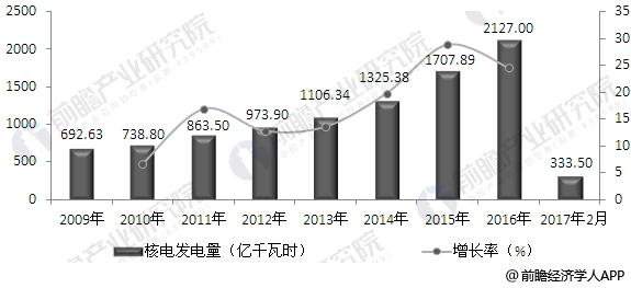 2008年以来,我国核电发电量逐年增长,近两年的增速有所提高。2015年,我国核电发电量达1707.89亿千瓦时,同比增长28.86%;2016年,我国核电发电量为2127.00亿千瓦时,同比增长24.54%,达到历年新高;截至2月份,2017年的核电发电量达到333.50亿千瓦时。