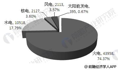 就发电结构来看,2016年,水电发电量10518亿千瓦时,占全国发电量的17.8%;火电发电量43958亿千瓦时,占全国发电量的74.37%;核电、风电和太阳能发电量分别为2127亿千瓦时、2113亿千瓦时和395亿千瓦时,比重分别为3.60%、3.57%和0.67%。