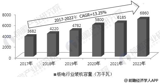 根据《核电中长期发展规划(2011-2020年)》以及核电十三五规划,前瞻产业研究院预判到2022年我国核电总体装机容量将超过6800万千瓦,在建装机容量超过3000万千瓦,2017-2022年均复合增长率在为13.25%,核电产业发展空间巨大。