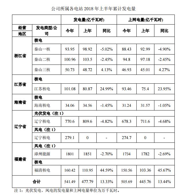 中国核电所属各电站2018年上半年累计发电量。(数据来源:中国核电)