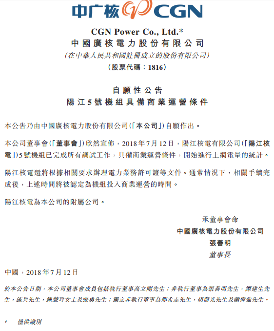 中广核电力公告,2018年7月12日,公司的附属公司阳江核电有限公司5号机组已完成所有调试工作,具备商业运营条件,开始进行上网电量的统计。阳江核电还将根据相关要求办理电力业务许可证等文件。通常情况下,相关手续完成后,上述
