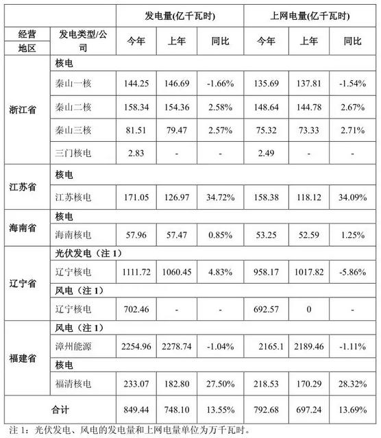 秦山二核、秦山三核、海南核电前三季度累计发电量较去年同比略有增加,主要原因为机组大修安排不同,且今年发电售电形势优于去年。