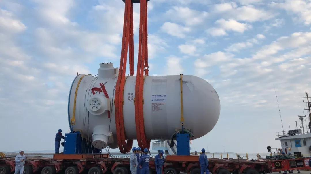 装载福清核电6号机组反应堆压力容器的“锦弘之路”船舶抵达福清自备码头,于下午18:05完成 “华龙一号”福清6号机组反应堆压力容器的卸船、短倒运输及临时存放等作业。