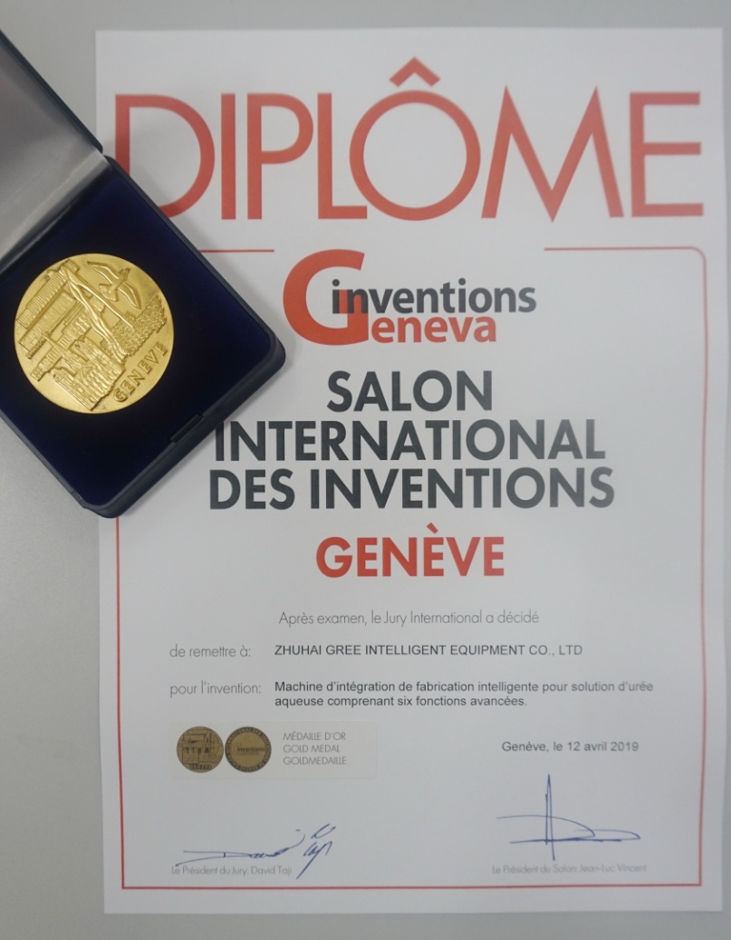 格力车用尿素水溶液智能制配一体机获得了日内瓦发明展金奖。该产品搭载了格力超纯水制备、空气能热泵节能加热、溶液高效循环搅拌、智能监测、溶液自动存储、便捷加注的六位一体核心技术,解决了传统技术模式存在的加注不方便、白色垃圾污染、成本高昂、尿素溶液易变质等问题,实现了尿素水溶液生产技术的跨越式发展,开创了国家乃至全球处理氮氧化物污染的新技术流派,在净化汽车尾气、改善生态环境、减轻消费者负担、有助于政府监管等方面具有重大社会价值。