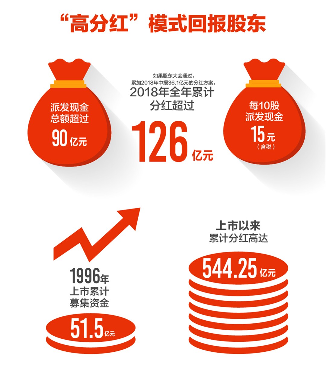 值得一提的是,格力电器公布的2018年度利润分配预案,计划向全体股东每10股派发现金15元(含税),若股东大会通过,格力将正式回归“高分红”模式,慷慨派出超90亿元“大红包”,累加2018年中报36.1亿元的分红方案,2018年全年累计分红超过126亿,刷新公司历年最高分红记录。自1996年上市以来,格力共募集资金51.5亿元,至今累计分红将高达544.25亿元,“最慷慨上市公司”“最具投资价值白马股”可谓实至名归。