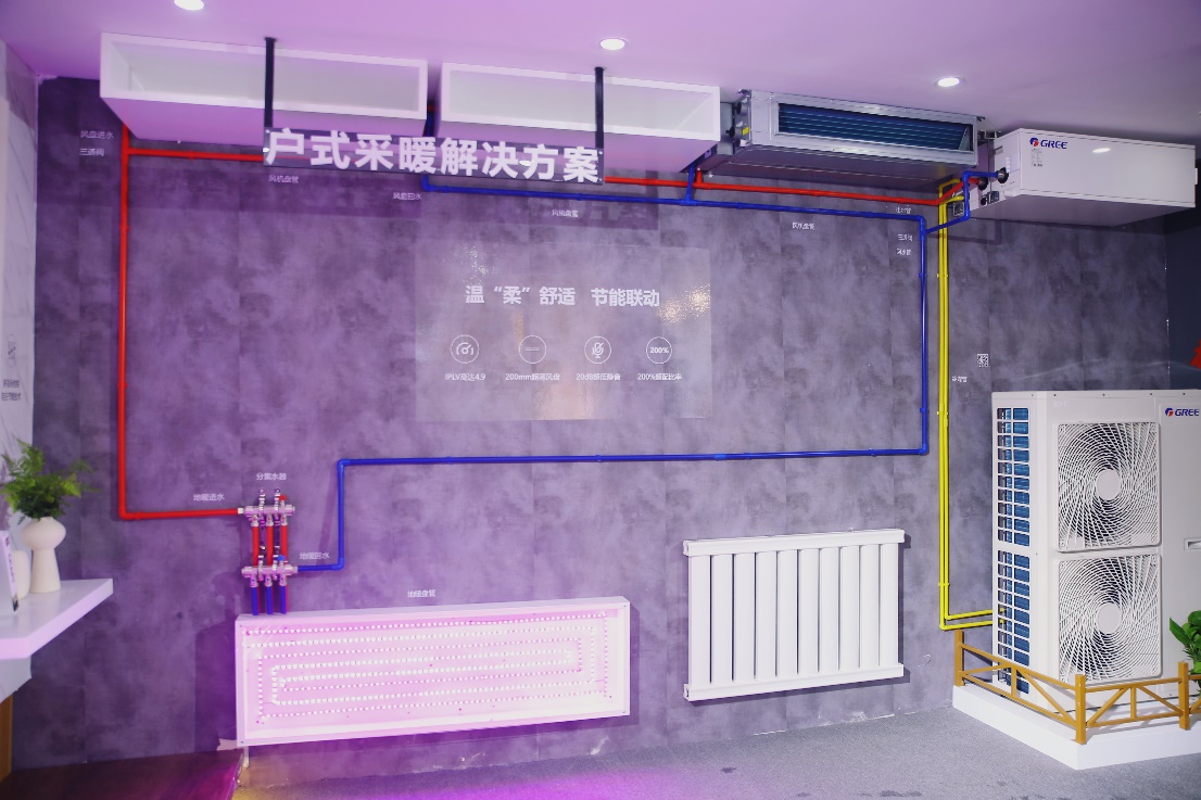 格力·火凤凰空气源热泵热风机包含了一拖一和多联式两种机型,二者专为北方冬季研发,针对极低温环境下制热衰减、房间温度不均匀、排放PM2.5产生雾霾等传统制热带来的弊端,分别提供了单间房间精准采暖解决方案和一户多间精准采暖解决方案。火凤凰系列的核心技术是其搭载的格力第二代双级大排量变频压缩机技术,大幅度提升低温制热量和运行能效,在室外-30℃时能够可靠运行、稳定制热;当室外-20℃时制热量不衰减,室内出风温度最高可达54℃。此外,该系列还通过上下出风设计实现了地暖式效果,并采用了环保冷媒和全直流变频技术,解决北方采暖存在的用户痛点,为用户创造温暖、健康、节能的取暖体验。更值得一提的是,此次展出的火凤凰一拖一机型还特别搭载了光伏板,为供热提供清洁能源,实现节能环保。