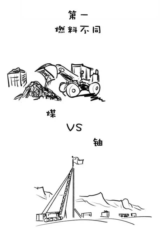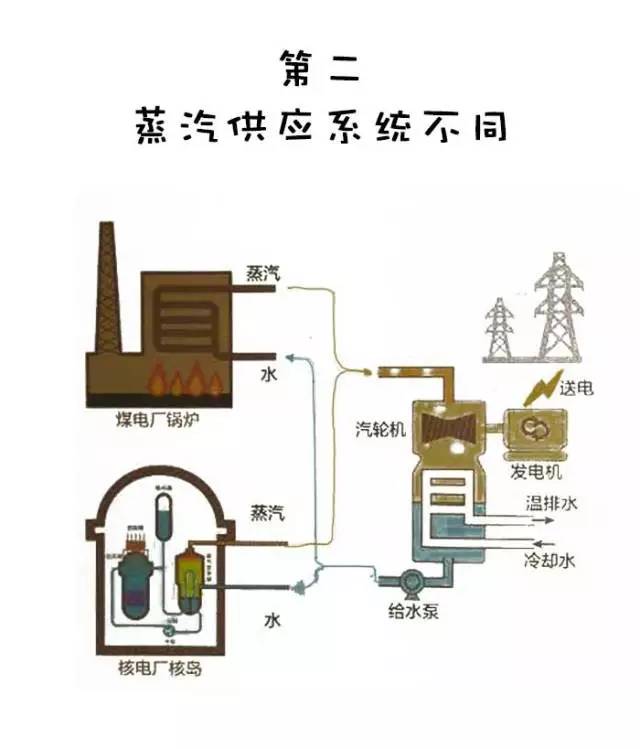 核电厂是依靠燃烧化石燃料(煤)释放的化学能制造蒸汽,而核电厂则依靠核燃料(通常是铀)的核裂变反应释放的核能来制造蒸汽。