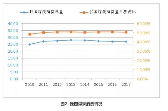 煤炭在我国能源消费结构中占据绝大部分。2010~2017年,我国煤炭消费量由24.98亿吨标准煤增至27.04亿吨标准煤,增长了8.22%。我国煤炭消费量占世界煤炭消费总量的比重由48.51%增至50.72%。