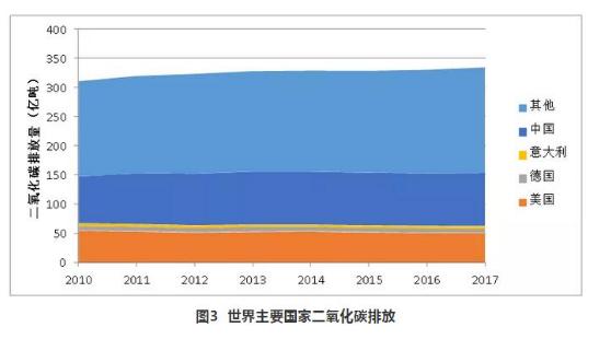 2010~2017年,我国能源使用排放的二氧化碳由81亿吨增加至92亿吨,增长了13.9%;占世界二氧化碳排放总量的比重由26.08%增至27.61%。现阶段,我国温室气体排放面临巨大的国际压力。
