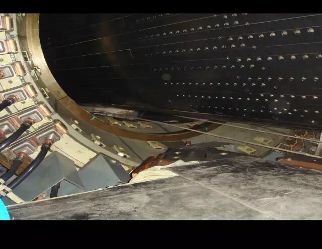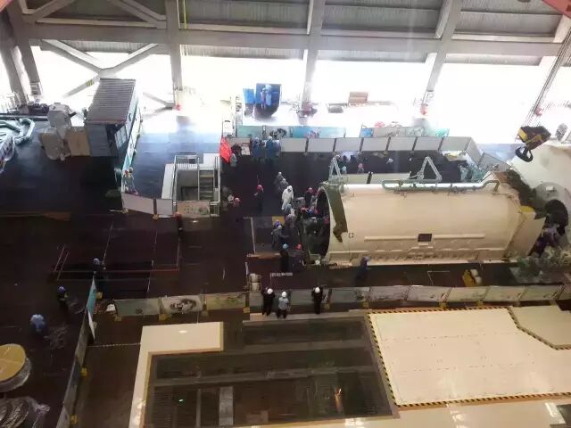 5.5 继续移动转子,待滑架要上弧形滑板时,稍稍降低转子励侧,使转子汽侧微微翘起,让滑架顺利地进入滑板,汽侧的监护人员可随滑架一起进入定子膛内。