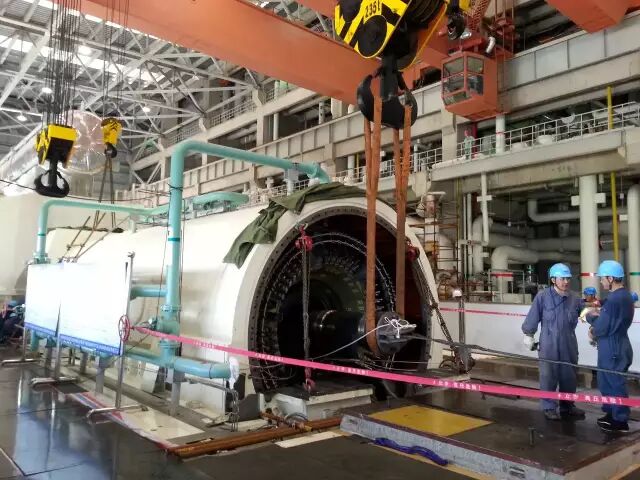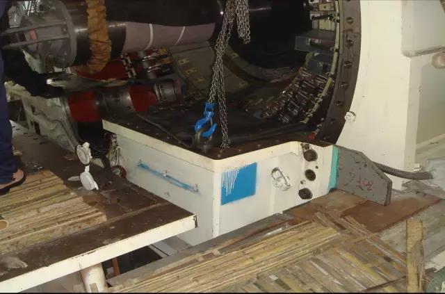 3.3 用行车微抬起汽侧转子,松掉抬轴架的两根顶丝后落下转子,使转子完全坐落在汽侧滑块和励侧层压板上。