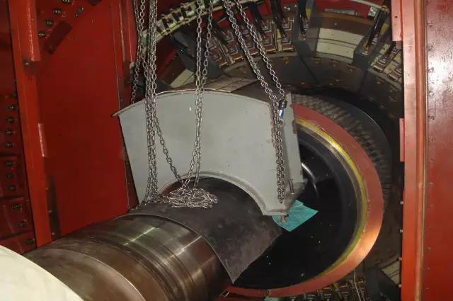 2.1 行车抬起励侧转子,取出转子与定子铁芯间层压板,