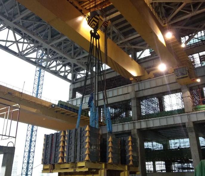 福清核电6号机组常规岛厂房内设置了2台起吊重量分别为80/20吨和350/60吨的桥式起重机,安装标高分别为+21.5米与29.5米,跨度为47.1米,两车运行时可以交替,且都能达到厂房的两端。在安装以及维修期间它将为整个汽轮机厂房内汽轮发电机组及其辅助设备提供吊装服务。