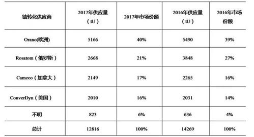 欧洲市场铀转化方面,欧盟2017年接收1.28万吨铀转化服务,主要来自四家供应商,分别是Orano(40%)、Rosatom(21%)、Cameco(17%)和ConverDyn(16%)。