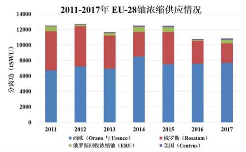在铀浓缩方面,欧盟主要有4个来源:分别是西欧的Orano与Urenco,俄罗斯的Rosatom,俄罗斯浓缩后处理铀(ERU)与美国的Centrus。据统计,2017年欧盟共接收了约1.09万tSWU铀浓缩服务。
