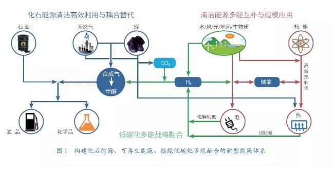 例如:煤化工大多属于低碳分子重构的放热过程,石油加工属于大分子裂解的吸热过程,两者的耦合不仅可以大幅提高能效,也可以弥补各自的不足;利用可再生能源、高温核能等制取的氢,可以补充煤化工之所缺,也可以与 CO2 通过催化耦合而制取油品和大宗化学品,总体上实现 CO2 减排;可再生能源可通过规模储电而提高并网利用效率;多种技术的结合可以因地制宜地形成低碳化清洁能源供应系统,促进能源消费革命等。