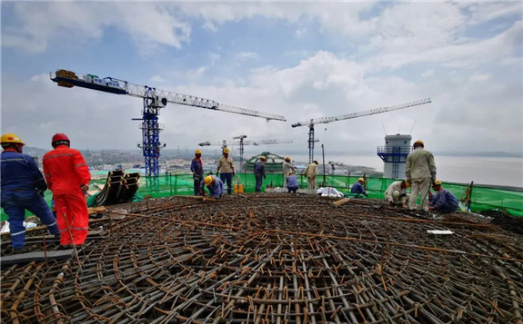 针对外穹顶施工的重要性和复杂性,华龙示范工程建设各单位高度重视、通力协作,先后组织了施工先决条件检查、安全、质量专项检查及多次现场综合隐蔽检查,对检查发现的问题及时制定方案并整改完善,成功克服了工期短、工程量大、承重架搭设安全风险高及多雨高温天气等诸多困难,共同促进了“华龙一号”外穹顶封顶混凝土浇筑完成。