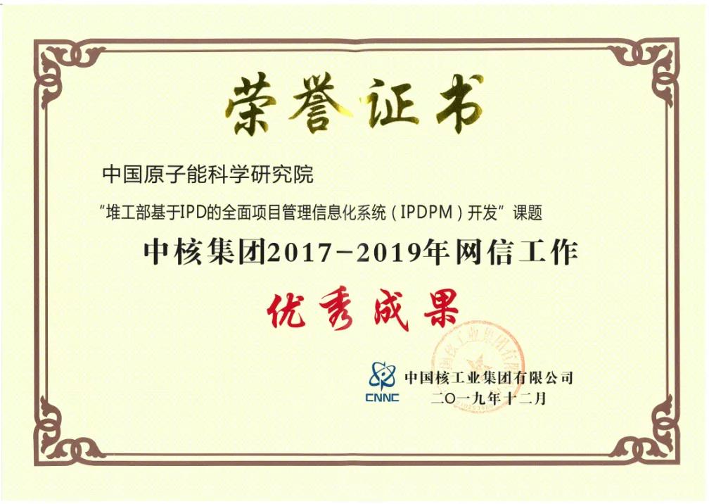 在中核集团2017-2019年度网络安全和信息化工作评优中,原子能院堆工部“基于IPD的全面项目管理信息化系统(IPDPM)开发”和“快堆工艺仿真和虚拟验证系统开发”两项课题被评为优秀成果。