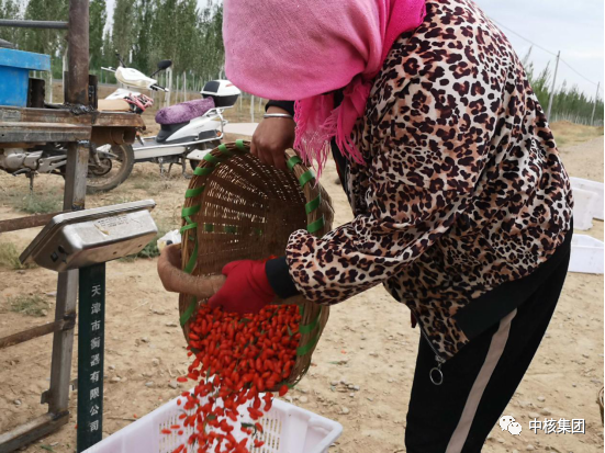 带着采摘下来的一筐筐火红的枸杞鲜果,村民们来到基地的卡车边,工作人员在这里边指挥着村民们排队给枸杞过秤,边为村民们现场发放采摘款,每斤费用1.5元。过秤后的枸杞鲜果倒入统一规格的白色箱子,运往不远处菊花台庄园枸杞种植有限公司的车间,过不了几天,枸杞干果、枸杞原浆、枸杞酵素等深加工产品便会新鲜面市。