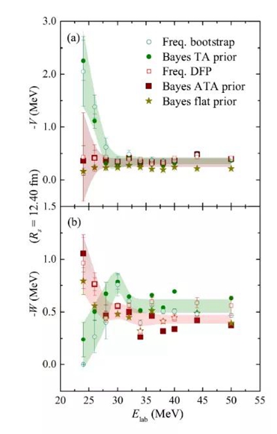 从弹性散射抽取反应体系的相互作用势,是国际上常用的一种方法。该工作针对弱束缚核6Li+209Bi(锂6+铋209)体系,利用贝叶斯方法对其弹性散射数据进行了分析,考察了三种不同先验分布对所提取的相互作用光学势的影响(结果如图所示)。研究表明,贝叶斯方法的结果强烈依赖于先验分布。然而,这三种迥异的先验分布都能很好地重现实验的弹性散射角分布,说明弹性散射并不能对光学势参数进行足够的约束。在此情况下,研究人员建议使用传统无约束的频率方法或者均匀分布的贝叶斯方法做数据分析。在此基础上,研究人员进一步对通过转移反应抽取奇特核6He+209Bi(氦6+铋209)体系的光学势做了分析,结果表明,在合适的先验条件下,贝叶斯方法能够给出更准确的误差。