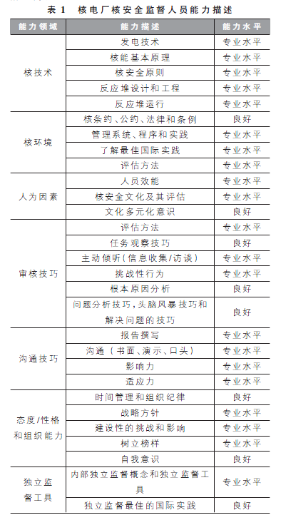 出的对核电厂核安全监督人员的能力描述(见表 1), 目前核电厂核安全监督人员要想完全达到还存在不小的距离。