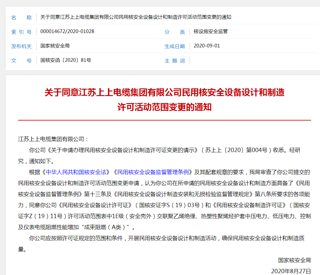 根据《中华人民共和国核安全法》《民用核安全设备监督管理条例》及其配套规章的要求,我局审查了你公司提交的民用核安全设备设计和制造许可活动范围变更申请,认为你公司在所申请的民用核安全设备设计和制造方面具备了《民用核安全设备监督管理条例》第十三条及《民用核安全设备设计制造安装和无损检验监督管理规定》第八条所要求的各项能力,同意你公司《民用核安全设备设计许可证》(国核安证字S(19)03号)和《民用核安全设备制造许可证》(国核安证字Z(19)11号)许可活动范围表中1E级(安全壳外)交联聚乙烯绝缘、热塑性聚烯烃护套中压电力、低压电力、控制及仪表电缆阻燃性能增加“成束阻燃(A类)”。