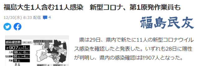 日本福岛县29日新增新冠肺炎确诊患者11人,累计确诊907人。其中,在东京电力福岛第一核电站工作的一名合作企业员工确诊,这是福岛第一核电站确诊的第3例新冠肺炎病例,29日的确诊病例与之前的病例没有关联。