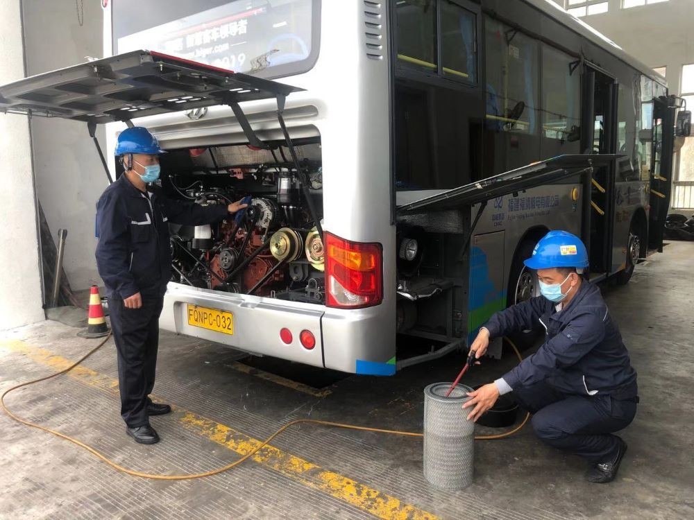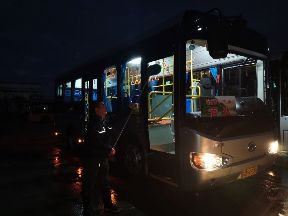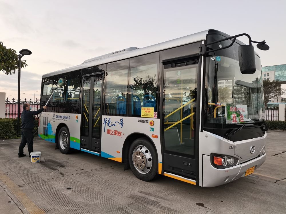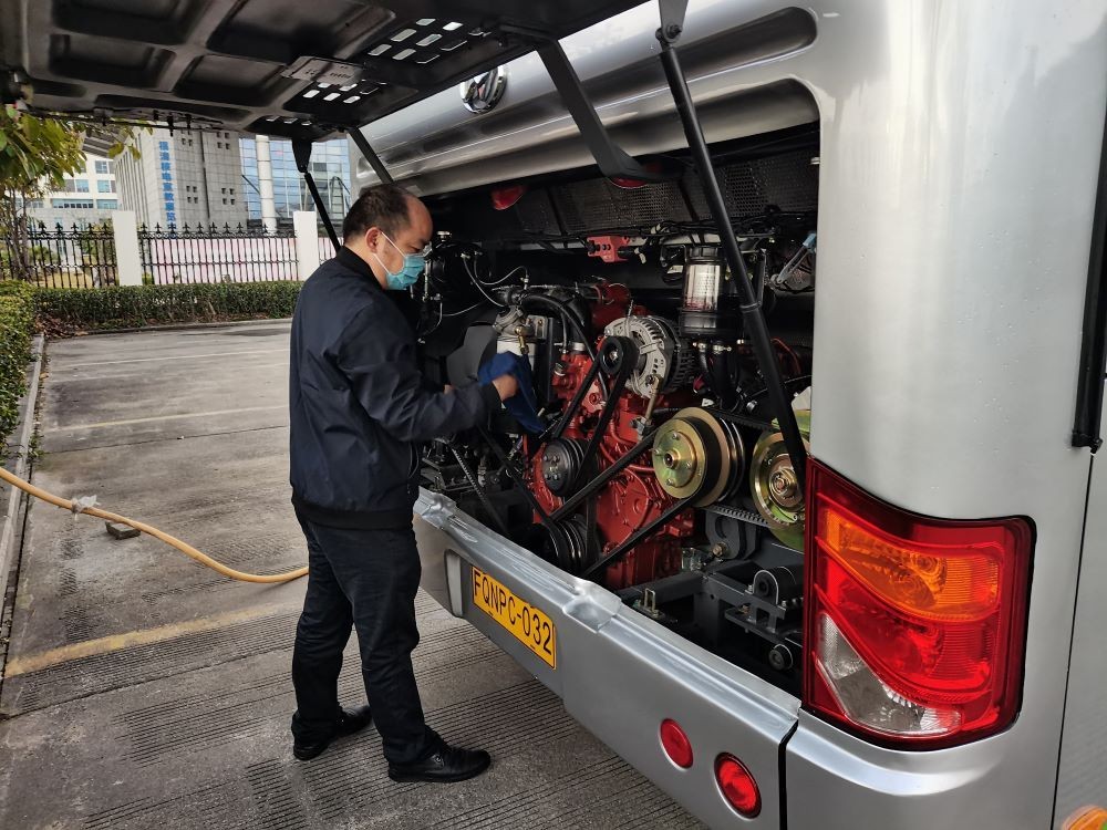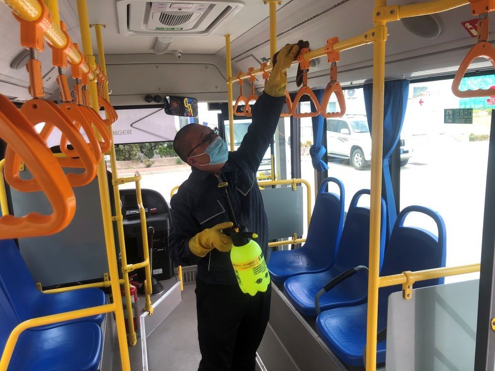 到达厂区,员工们下车了。驾驶员的任务还没有完成,他们停放好车辆,对发动机、车轮、制动、安全带等进行检查登记,对车窗、地板、扶手等卫生重点区域进行消毒。