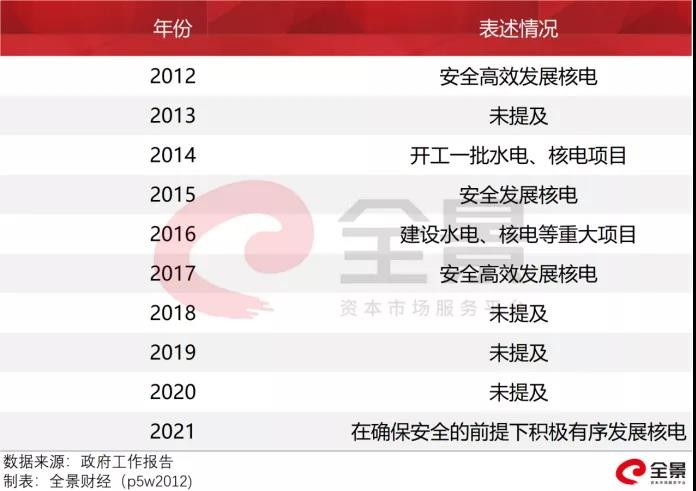 这是近十年来政府工作报告中来首次用“积极”的字眼来形容核电发展工作安排,相关表述是在2021年重点工作安排中第七点“加强污染防治和生态建设,持续改善环境质量”中“扎实做好碳达峰、碳中和各项工作”里出现。