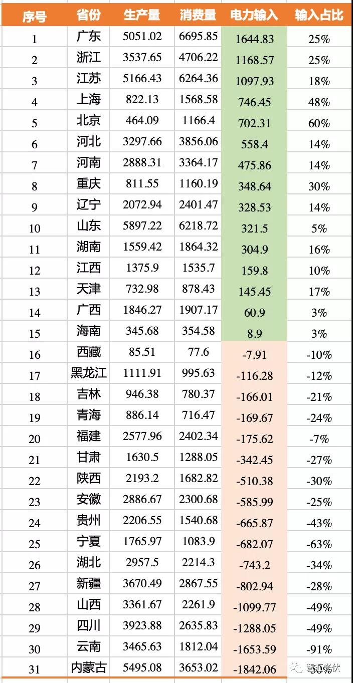 2019年,广东、江苏、山东省用电量位居前三,山东、内蒙古、江苏发电量位居前三;广东、浙江、江苏区外受电量位居前三,北京、上海、重庆区外受电占用电量的比重位居前三。表:2019年各省电力的生产、消费量(单位:亿kWh)。