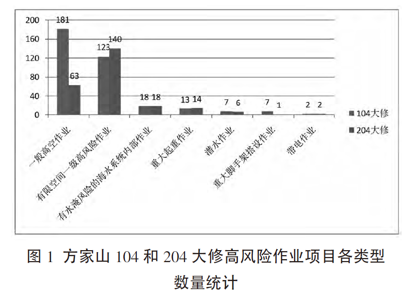 按照高风险作业分级分类情况,对方家山 104 和204 大修所有高风险作业项目以主要风险类型进行分类统计。数据显示,大修高风险作业项目类型分布主要变化一般高空作业从 104 大修的 181 项下降至 204 大修的63 项,主要原因是通过风险评定,公司程序进行了升版,对一般高空作业重新定义,保留了 5 米以上脚手架搭设作业,去除在 5 米脚手架作业的相关项目。如此一来使管理部门对现场的高风险管控更加精准有效。方家山 104 大修高风险作业项目数量前三的作业类型为:一般高空作业 181 项、有限空间一级高风险作业 123 项及有水淹风险的海水系统内部作业 18 项,分别占总项目数量 351 项的 51.6%、35.0%及 5.1%;方家山 204 大修高风险作业项目数量前三的作业类型为:有限空间一级高风险作业140 项、一般高空作业 63 项及有水淹风险的海水系统内部作业 18 项,分别占总项目数量 244 项的 57.4%、25.8%及 7.4%。详见图 1。