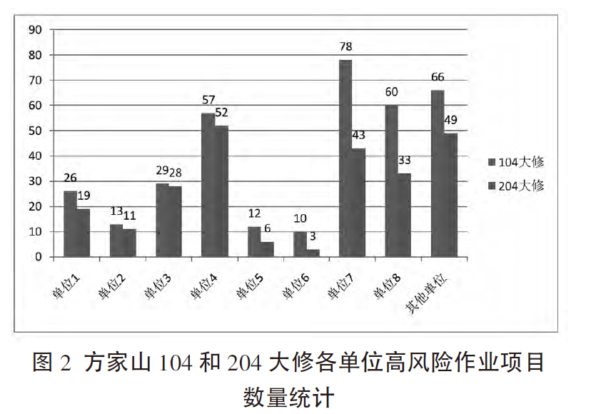 对方家山 104 和 204 大修所有高风险作业项目按责任单位进行汇总统计。数据显示,各单位大修高风险作业项目数目变化不大,方家山 104 大修高风险作业项目数量前三的协作单位为:单位 7 项目数量 78 项、单位 8 项目数量 60 项及单位 4 项目数量 57 项,分别占总项目数量 351 项的 22.2%、17.1%及 16.2%;方家山 204 大修高风险作业项目数量前三的协作单位为:单位 4 项目数量52 项、单位 7 项目数量 43 项及单位 8 项目数量 33 项, 分别占总项目数量 244 项的 21.3%、17.6%及 13.5%。详见图 2。