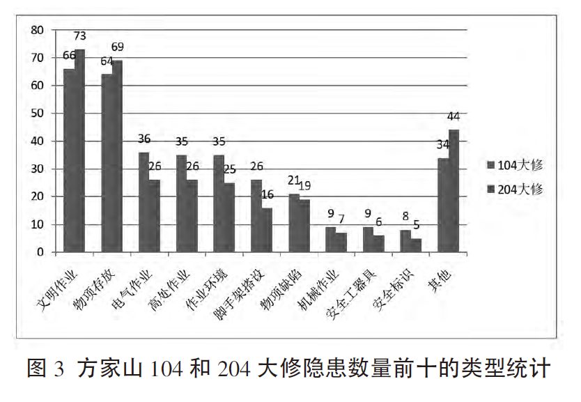 大修现场工业安全巡检是电厂换料大修期间安全工 作的重要项目之一,通过安全管理人员的现场安全监督 检查巡检等,及时发现厂房及作业现场等的异常、安全隐 患,并将其消除在萌芽状态,从而确保人员的人身安全。做好大修隐患的分类分析,可以更加了解大修检修过程 中存在的危险及有害因素,现场各单位安全水平状况及安全管理中的薄弱环节等,从而更好地完成大修风险控制。方家山 104 大修和 204 大修隐患数据统计如图 3。