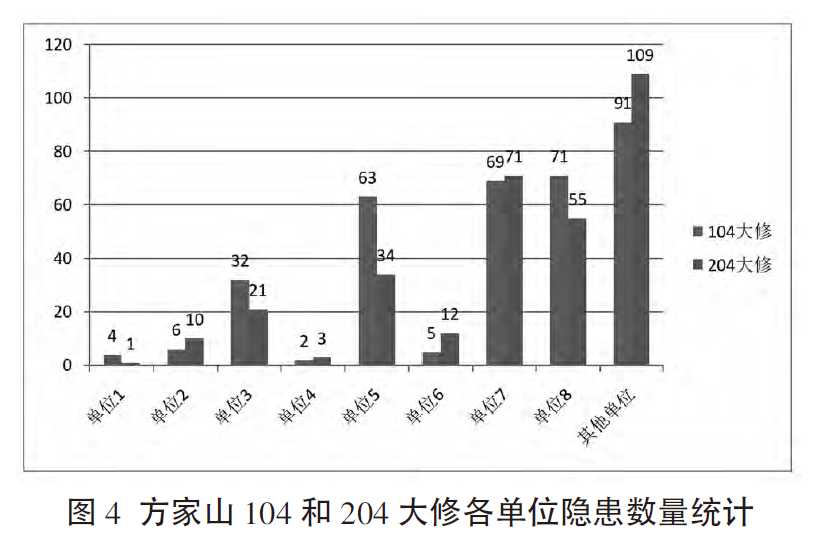 (3)图 4 数据显示,单位 1、单位 2、单位 4 和单位 6在大修中的隐患较少。以单位 4 为例,其在方家山 104 大修和 204 大修中主要承担防腐工作,涉及到密闭空间作业等的高风险作业项目分别为 57 项和 52 项,占比分别为 16.2%和 21.3%。以工作量而言,现场隐患明显偏少。大修期间可能存在对这些单位的监督不够到位。