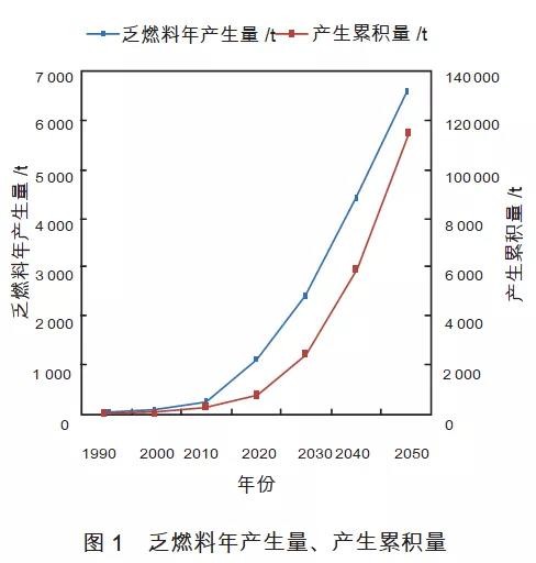 为保证核电站运行安全,乏燃料在堆贮存水池至少必须保证有一个堆芯和三分之一换料的安全裕量。鉴于此,本文基于乏燃料在堆冷却满10年后离堆贮存的前提假设,对乏燃料年离堆贮存量、离堆贮存累积量进行预测(图 2)。
