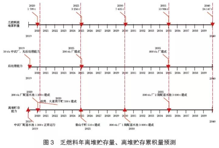 假设在运的后处理中试厂及配套水池正常运行,在建的田湾、大亚湾、秦山核电站的干法贮存设施,后处理示范厂、800t/a后处理厂的配套水池均按计划建成投运,后处理示范厂、800t/a后处理厂均比规划的时间节点推迟5年建成投运,结合乏燃料在堆冷却满10年后离堆贮存测算条件下的乏燃料离堆贮存累积量,对乏燃料离堆贮存实际需求进行预测。