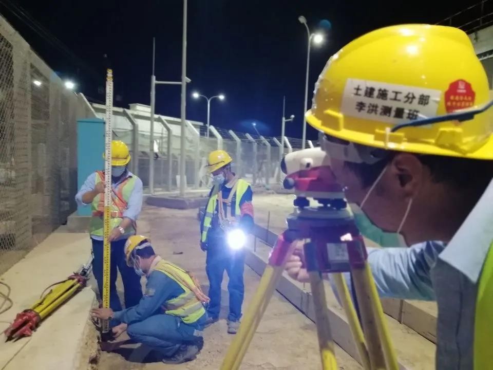 负责施工的两个分部连夜部署,选用青年骨干与党员、劳模组成了一支YA施工突击队。大家以“决战决胜一百天”为契机,咬紧牙关,为打好海外华龙攻坚战做年底最终的冲刺。YA施工方案的编审批、材料机械准备只有一周时间。每当夜幕降临,测量组一行人背着仪器消失在夜色中。晚上九点钟后,办公室里响起 “叮叮当当”卸放安全带与三角架碰撞的声音,这声音像驼铃一样,诉说着华兴人奋勇向前的故事。他们仅用2天时间便完成一万余平方米的场地地形测量工作。全站仪虽能测天绘地,但是测不出海外华龙一号首堆建设者无私奉献的精神高度。负责土建施工的技术主管王君,已经有16个月没有回家了。从接到任务开始到方案完成审批,他仅用了4天时间。白天忙于跟踪解决现场技术问题,晚上还要按计划完成分配的ITP关闭任务,每当夜深人静想起妻儿,便不免内心一阵酸楚,但他把这一切化作默默前行的动力。